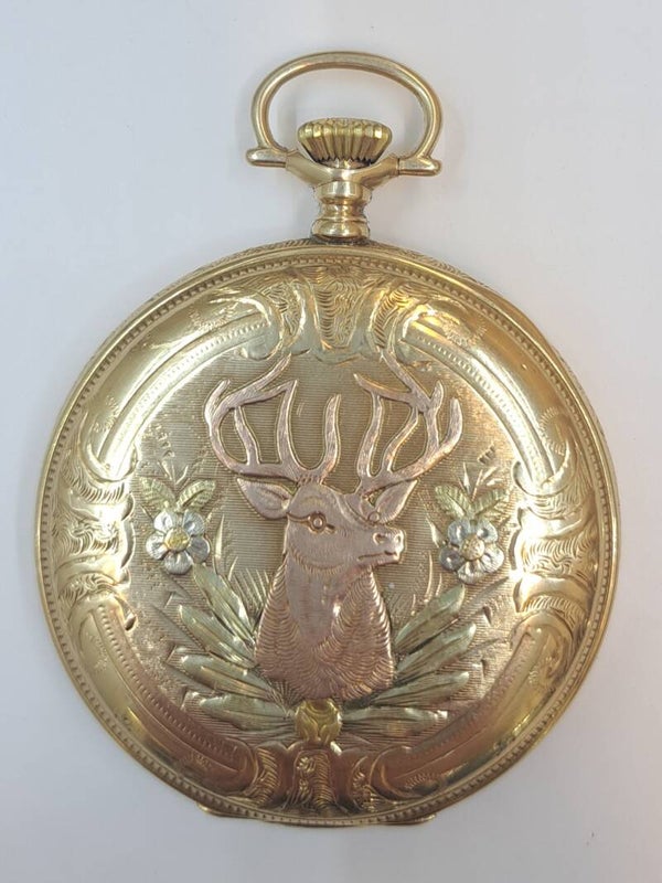 Kauniisti kuvioitu vedettävä 14k kultakello 15 jewel koneistolla. Valmistettu vuonna 1908. Kello huollettu ja käy oikein nätisti.
