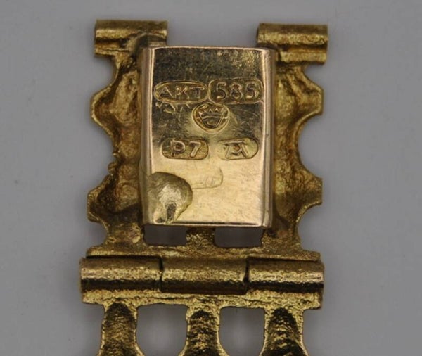 Vuonna 1968 Turussa valmistettu Tammenkorun 14K kultaranneke, todella hyvässä kunnossa. Upean näköinen käsityön näyte jonkalaista näkee harvoin markkinoilla.